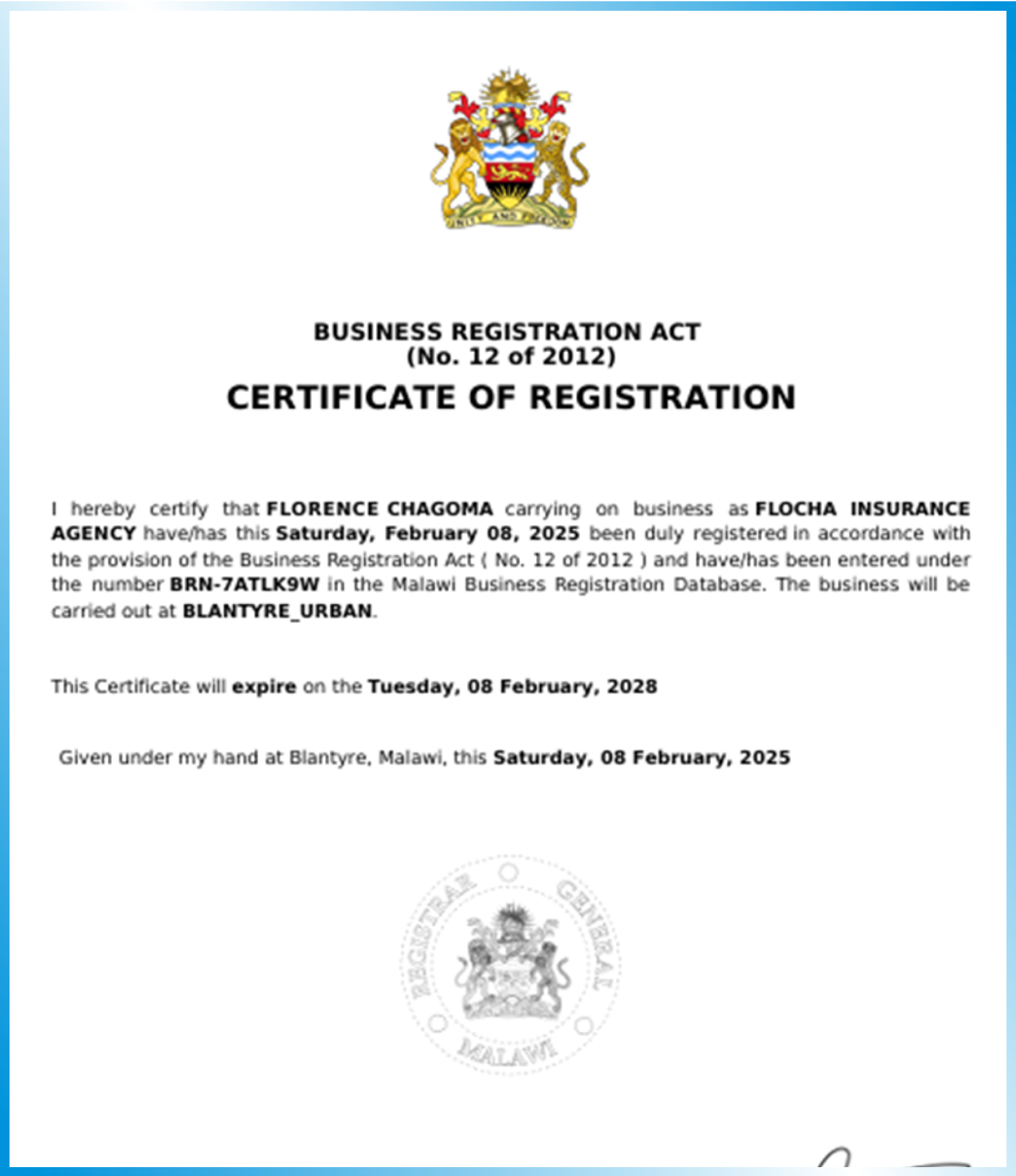 Registered under the Registrar of Companies, Flocha Insurance Agency is legally recognized to operate as a Malawian insurance business entity.