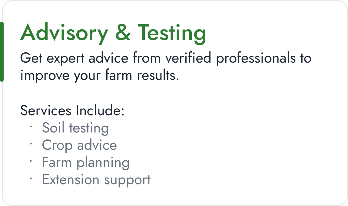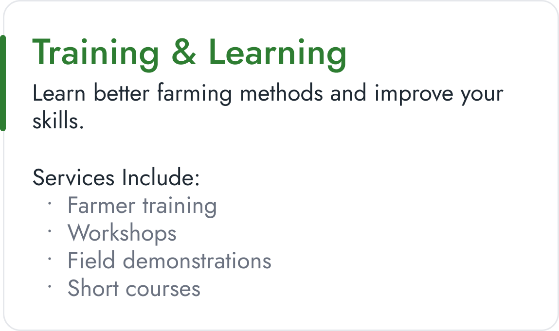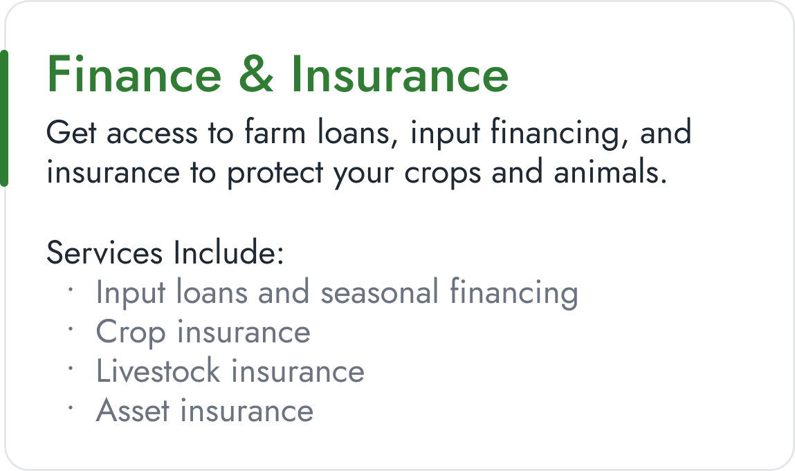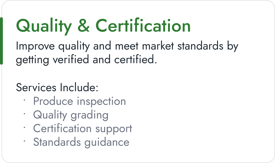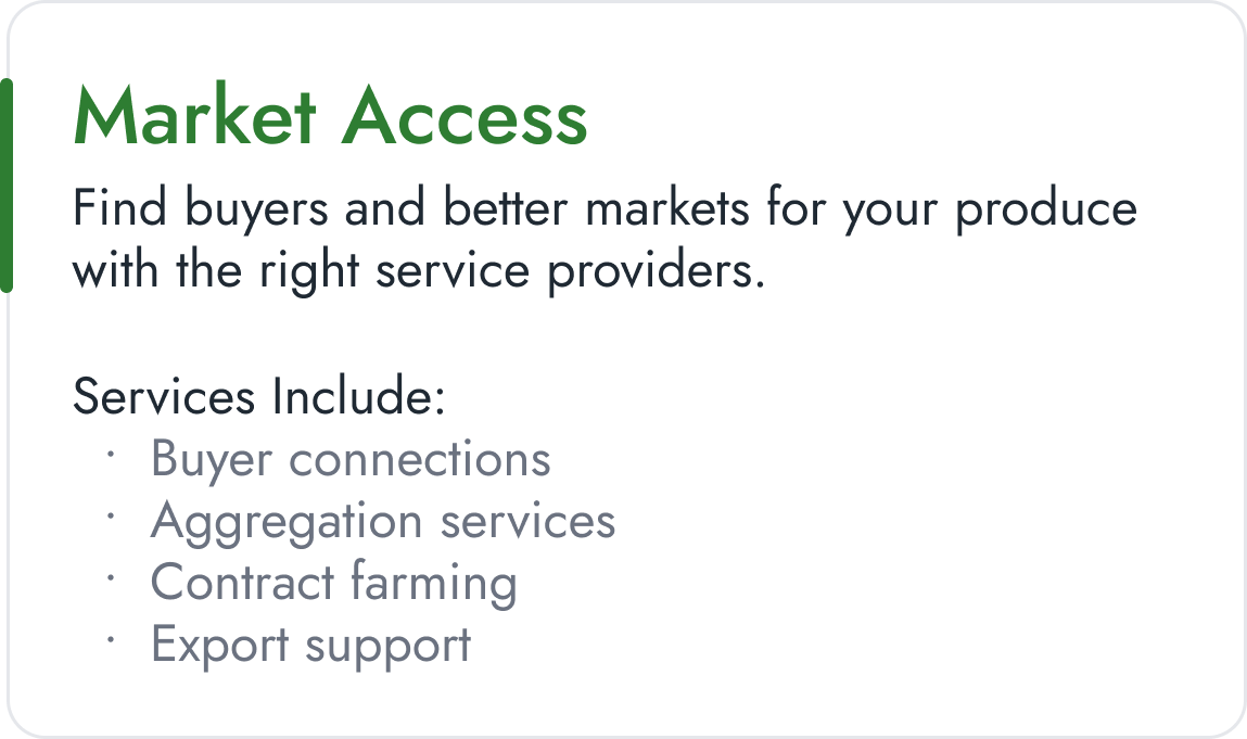 Access verified agricultural services—from finance and logistics to training and professional support—delivered by trusted providers across the value chain.
